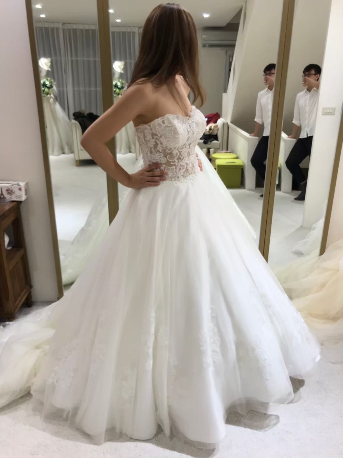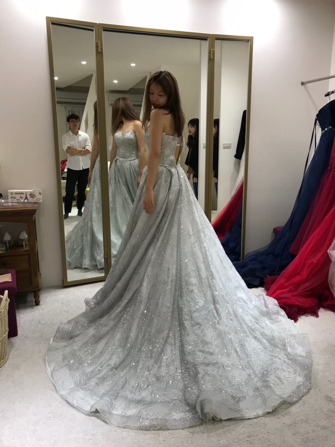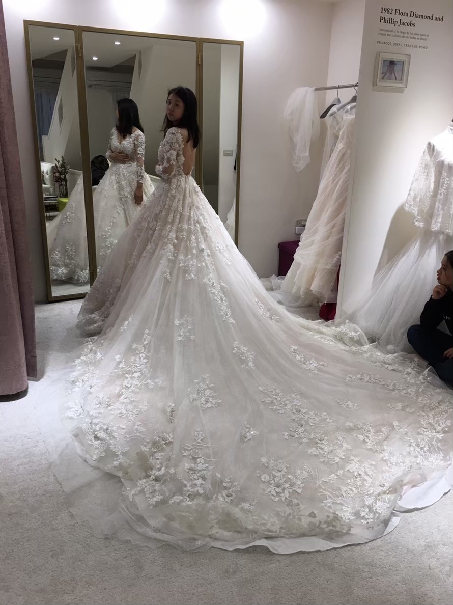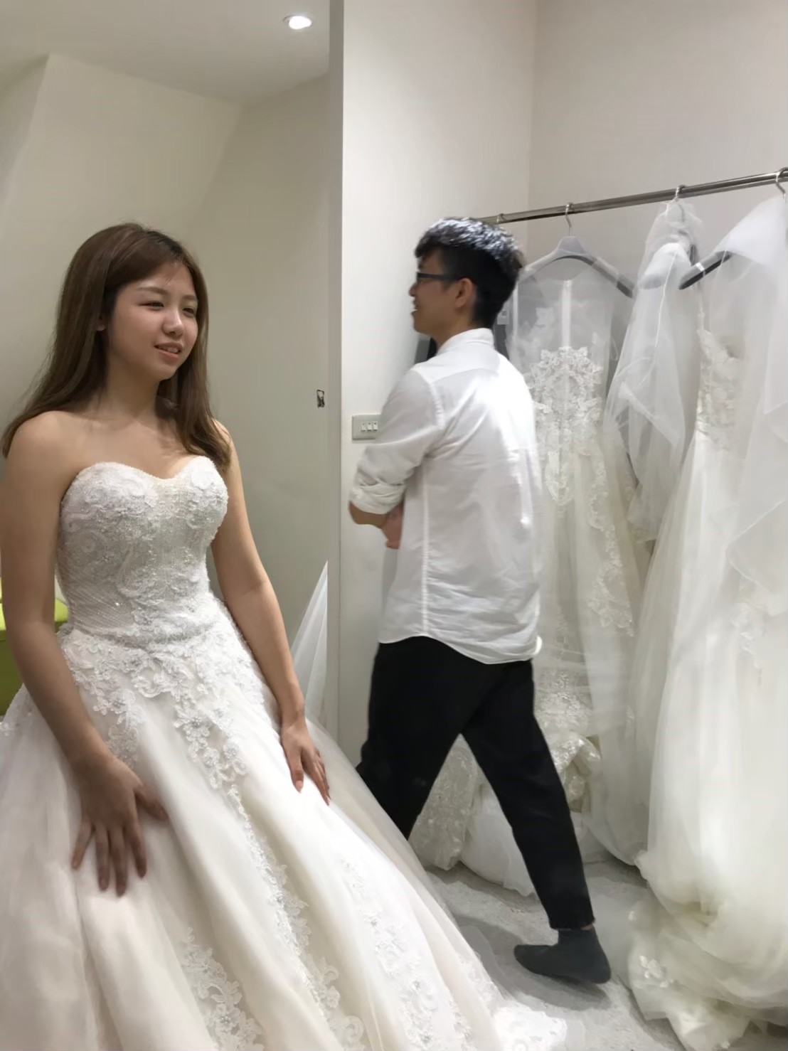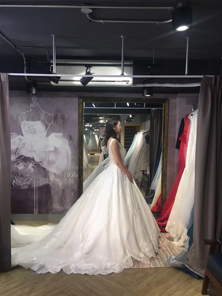 一組客戶,整個二樓都是禮服,前半部是白紗,可以讓新娘自己看到選擇跟摸,但晚禮服都