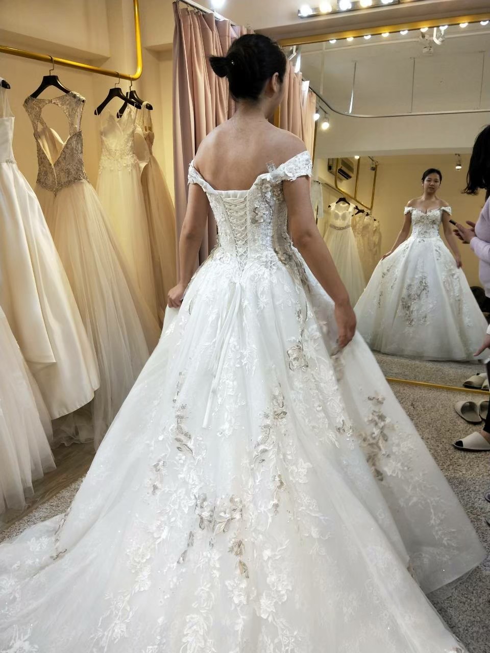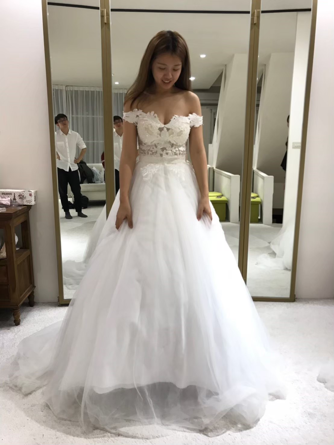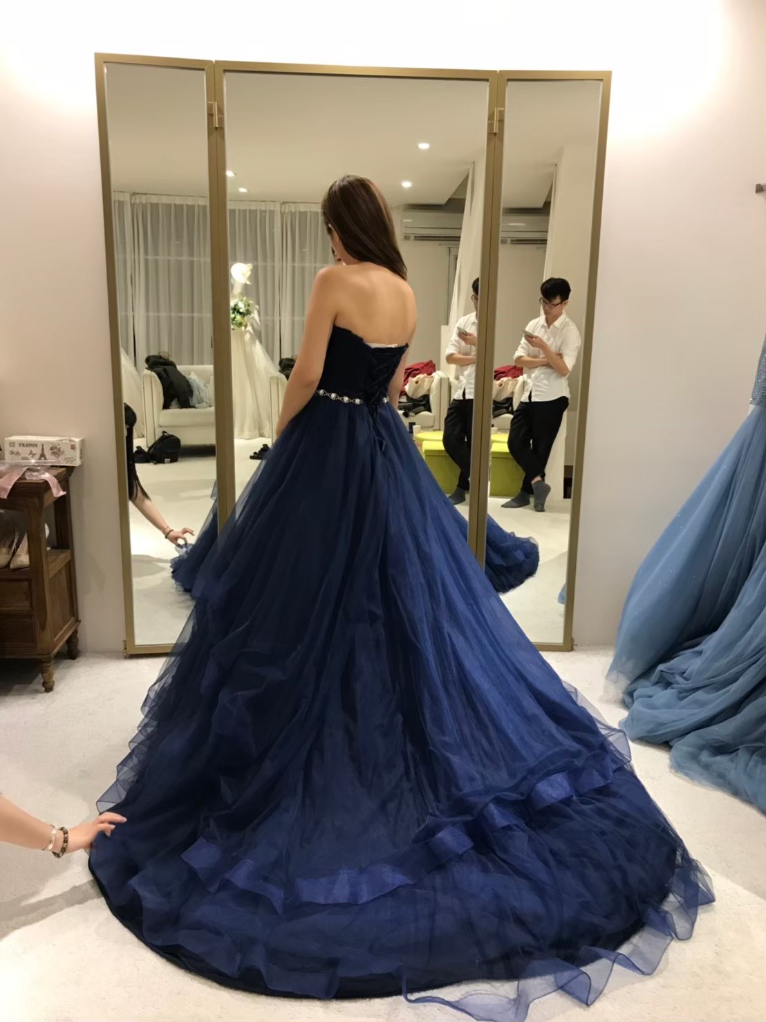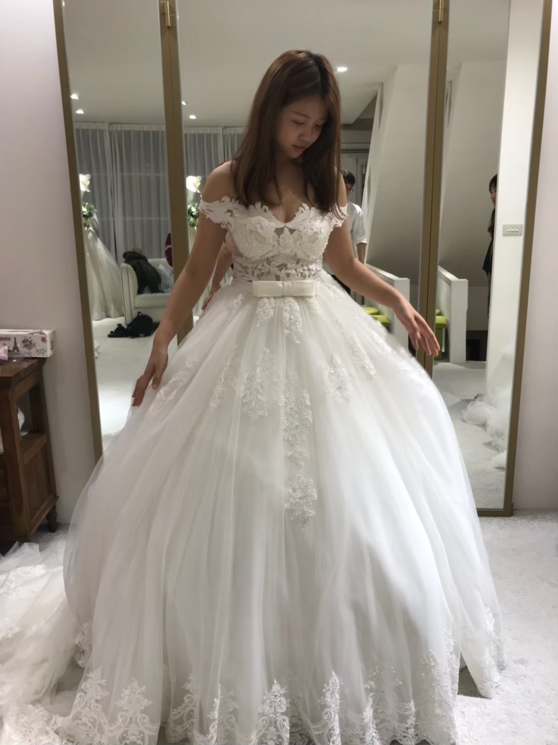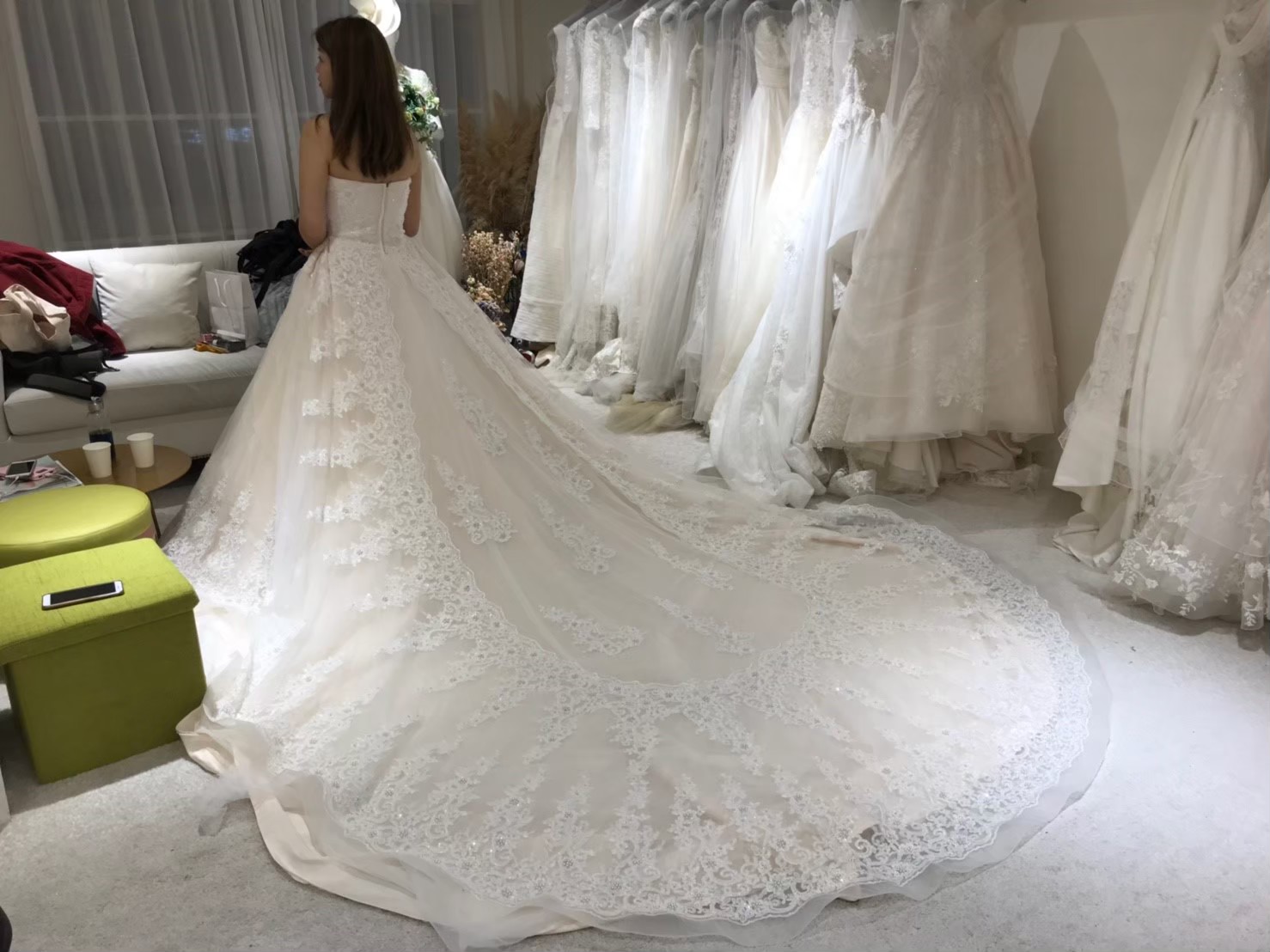 一組客戶,整個二樓都是禮服,前半部是白紗,可以讓新娘自己看到選擇跟摸,但晚禮服都