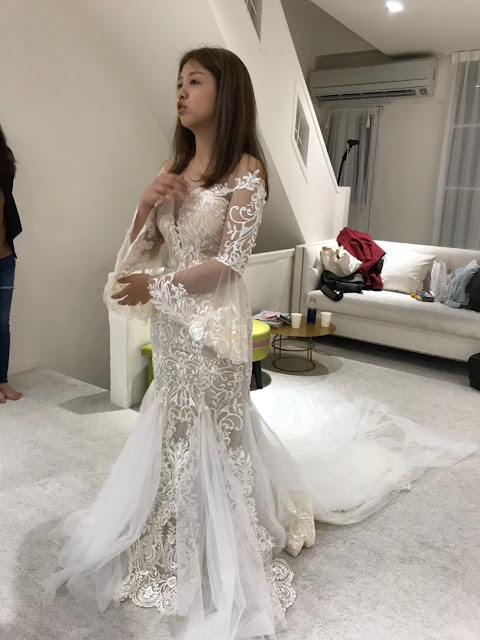 最後選這件白紗,請修改師把上身的白色胸墊剪掉,所以婚宴當天上身是白色蕾絲簍空,小秘書跟老公還有姊妹都驚呼 : 你確定要這樣做嗎?!!! 我很篤定說一定要,反正隱形胸罩是萊卡的,其實很接近我的膚色 |