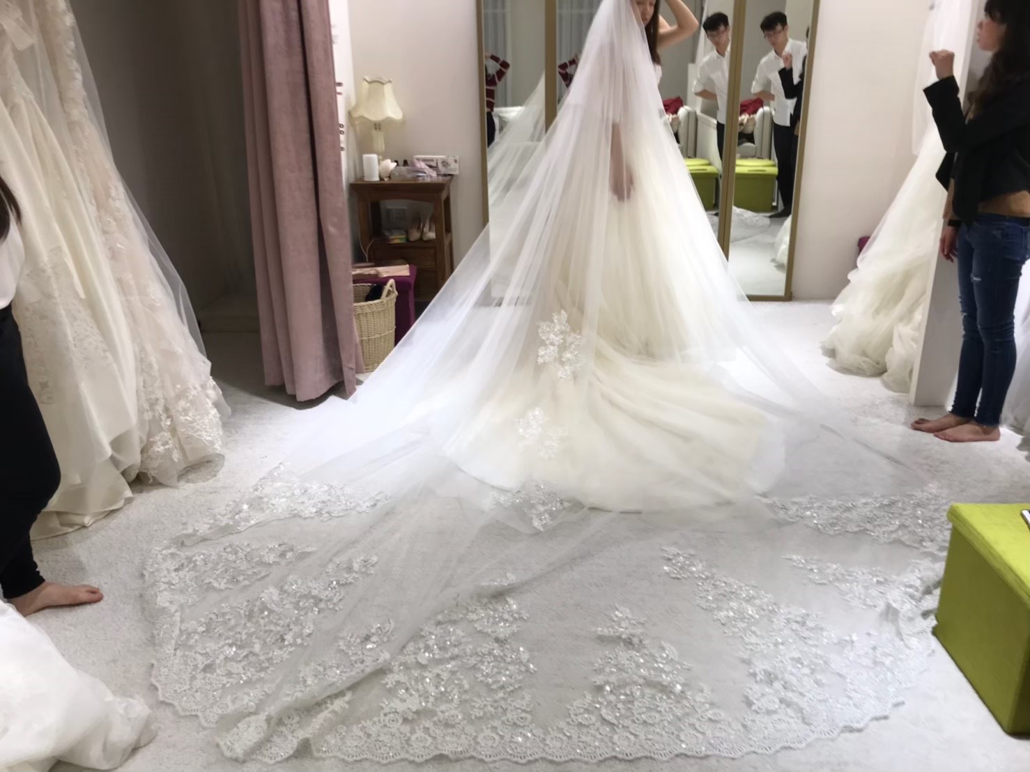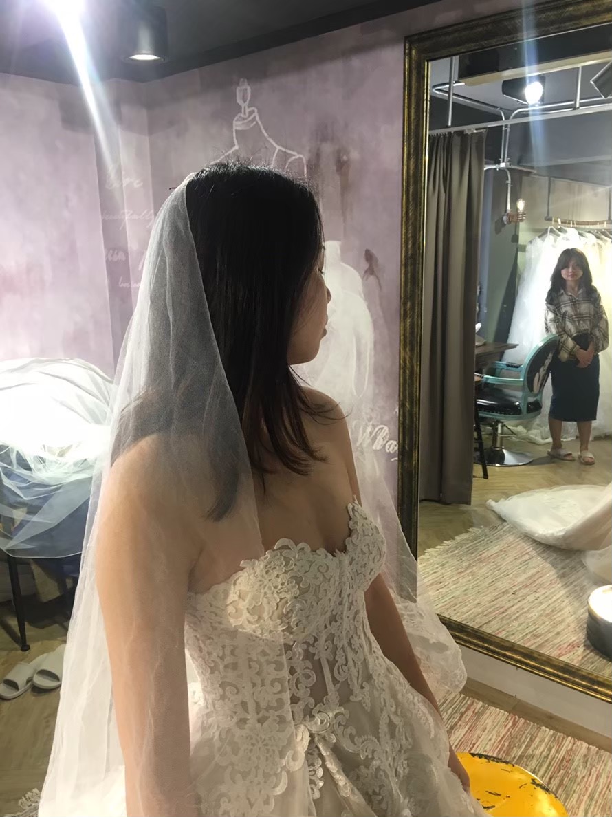 選擇頭紗的過程,長頭紗真的很浪漫,蕾絲上面還有水晶珠珠,拍照效果好 |