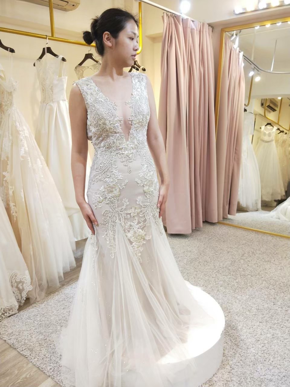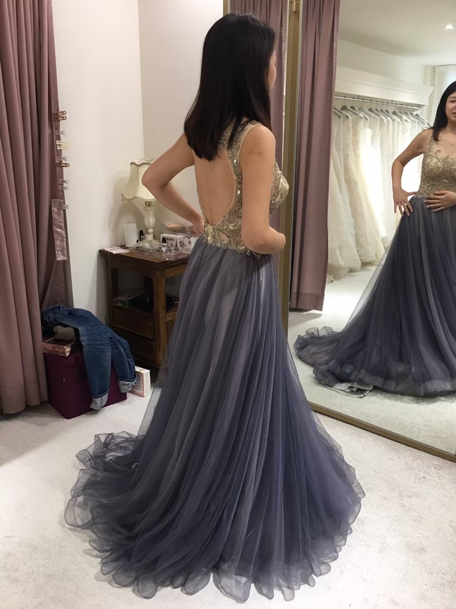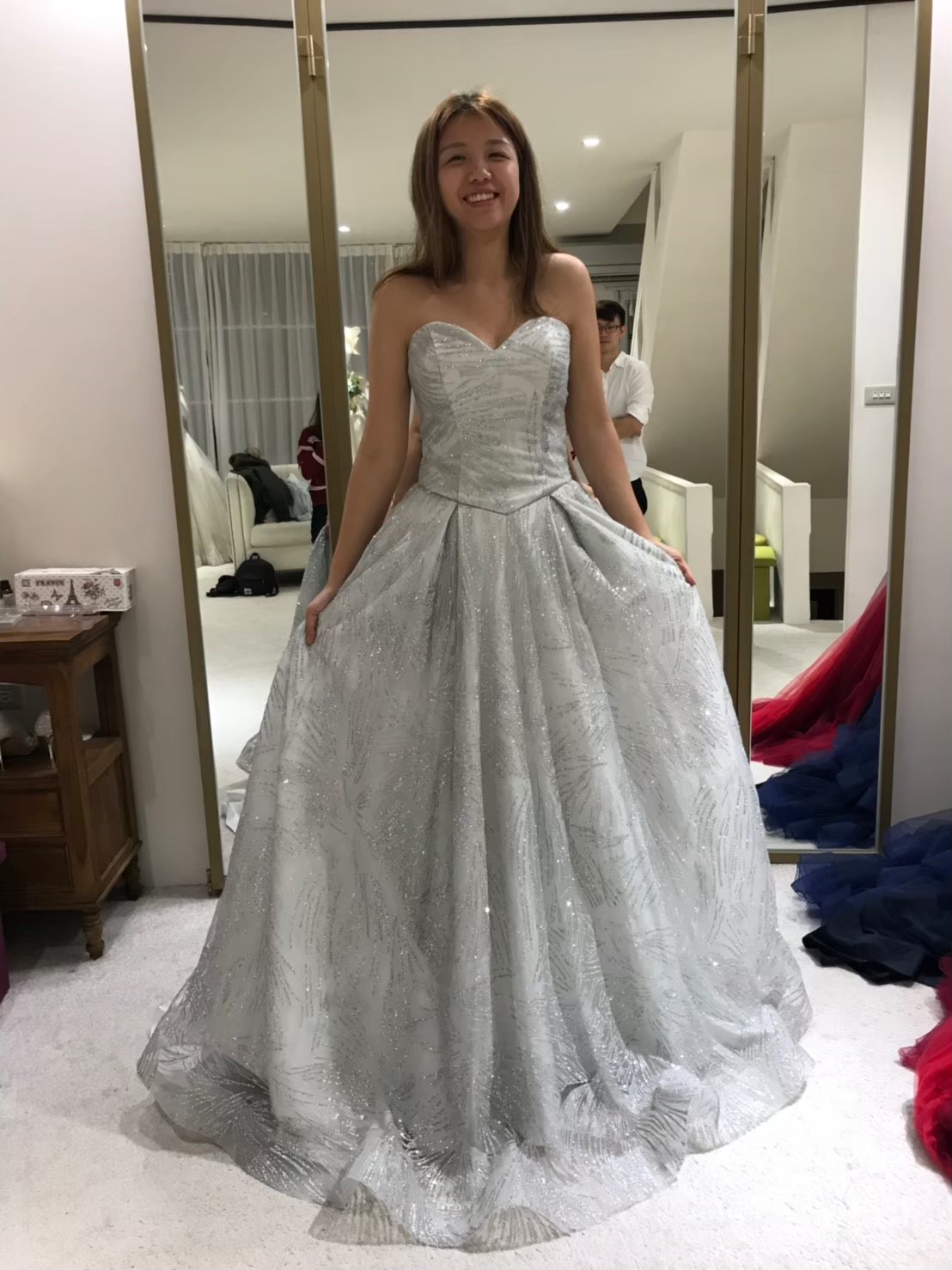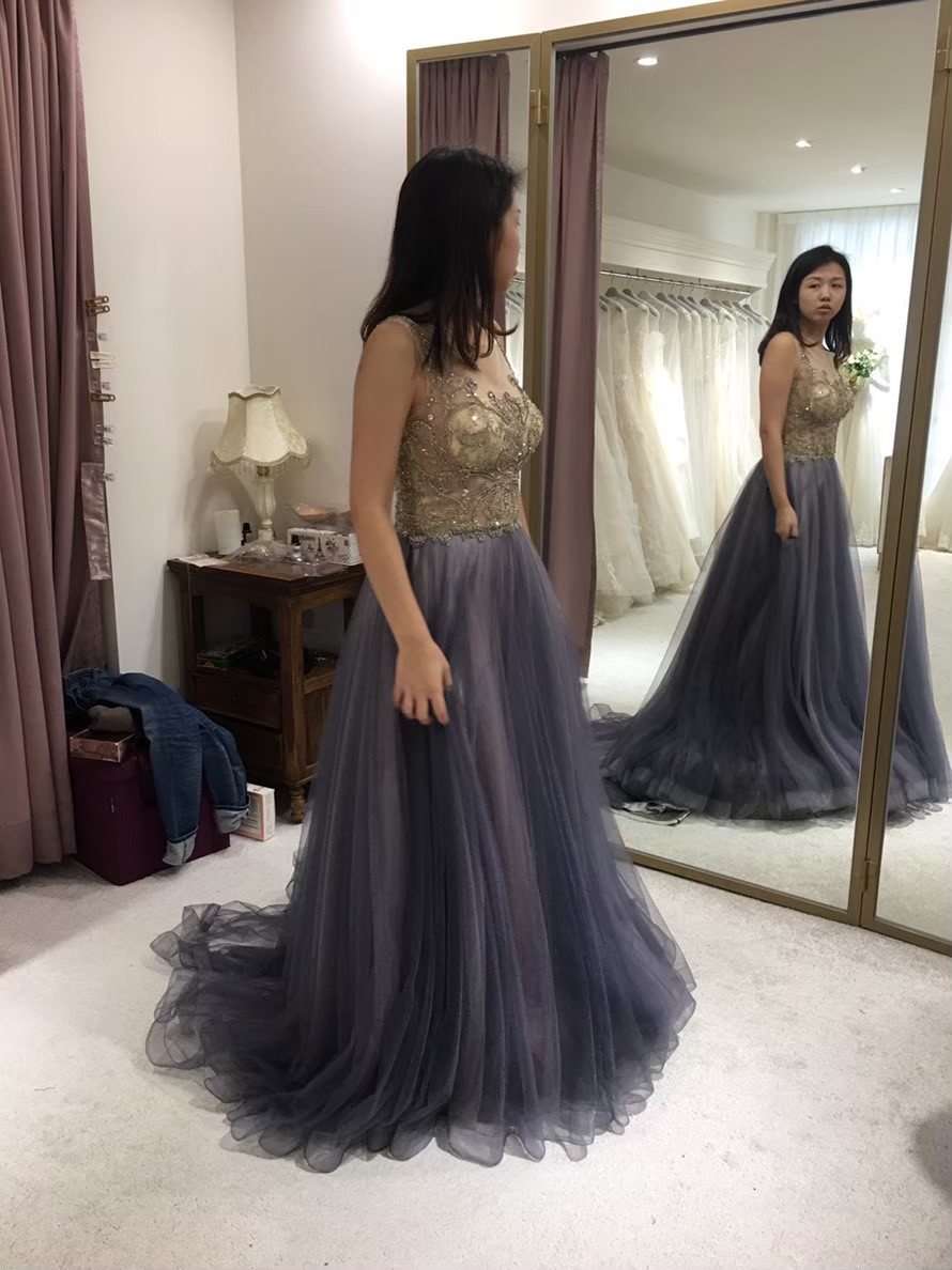 氣質裸膚色歐根紗+銀色亮片上身,這個拍照很不錯,布料很輕也可以晚宴,但亮片有點密集恐懼症發作,所以沒選上,這件像走在雲朵上 |