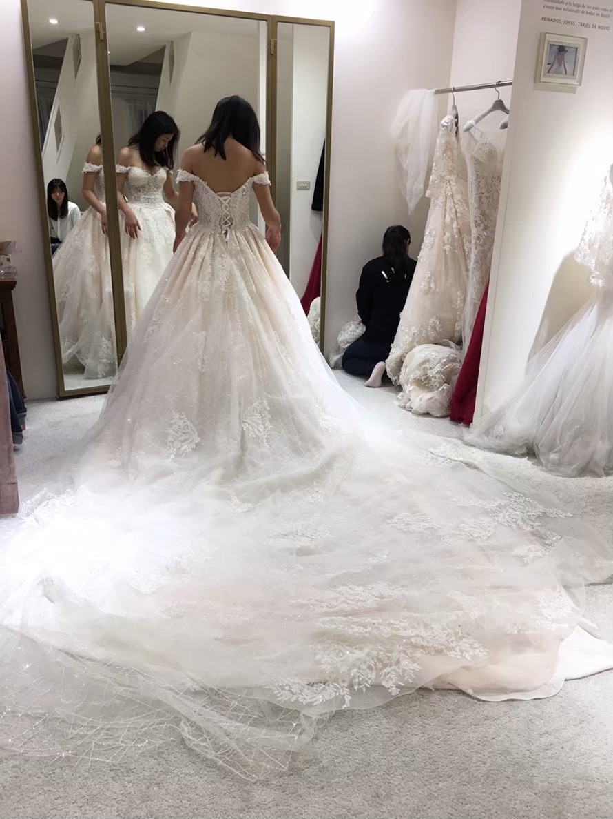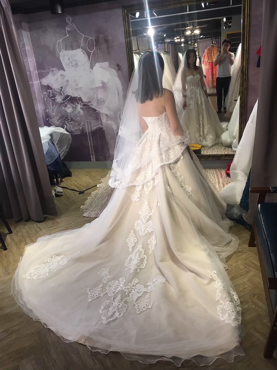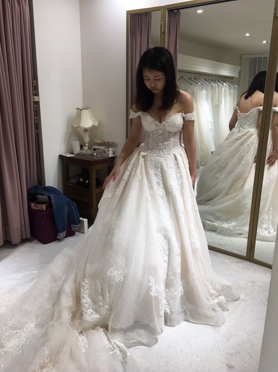 我..歷經至少十間店.....試穿了至少50件,才下定決心在某間全租從很便宜的買斷二手婚紗店、攝影師附屬婚紗館、純婚紗租借、婚紗店二手拍賣現場......說是