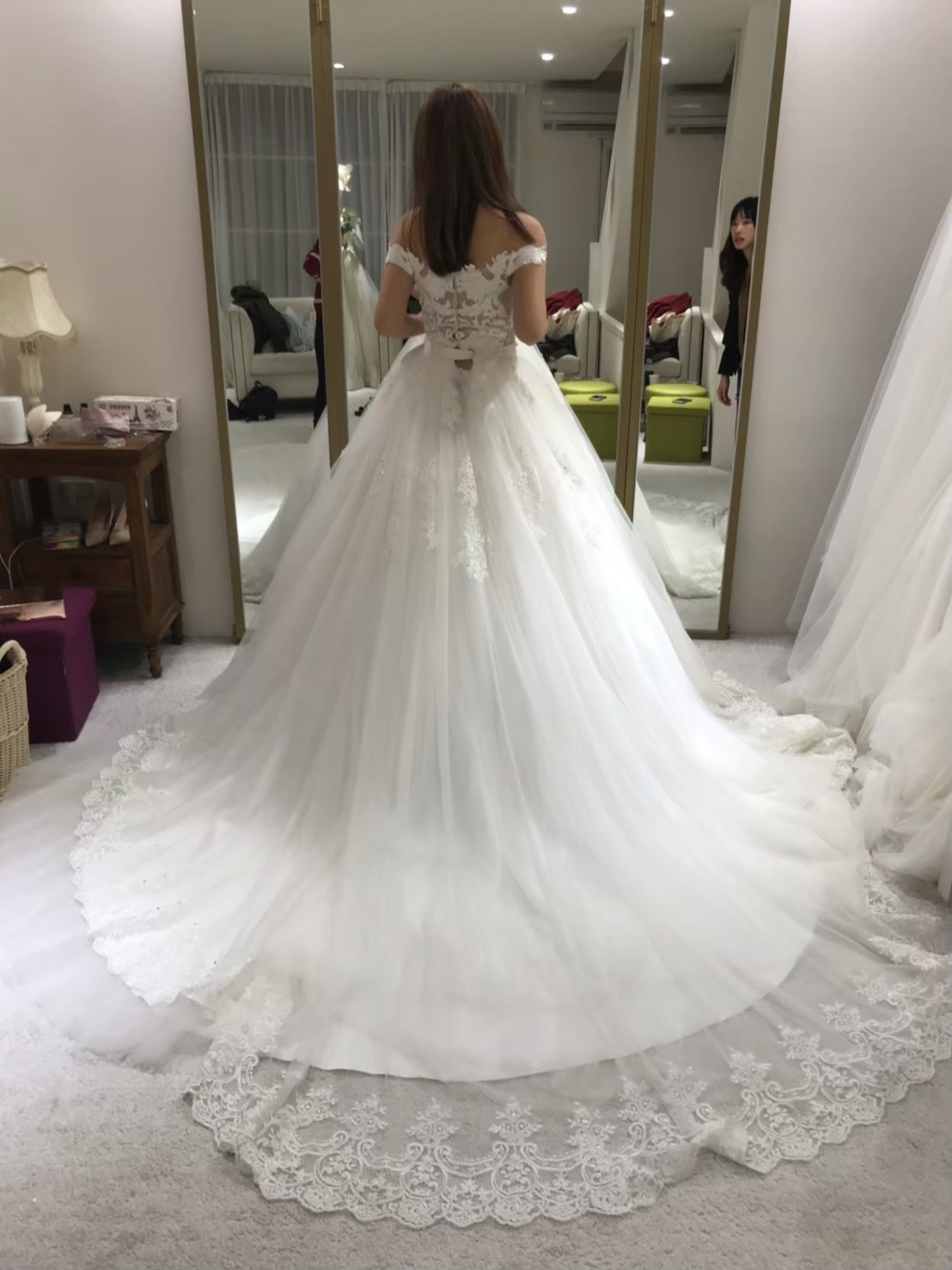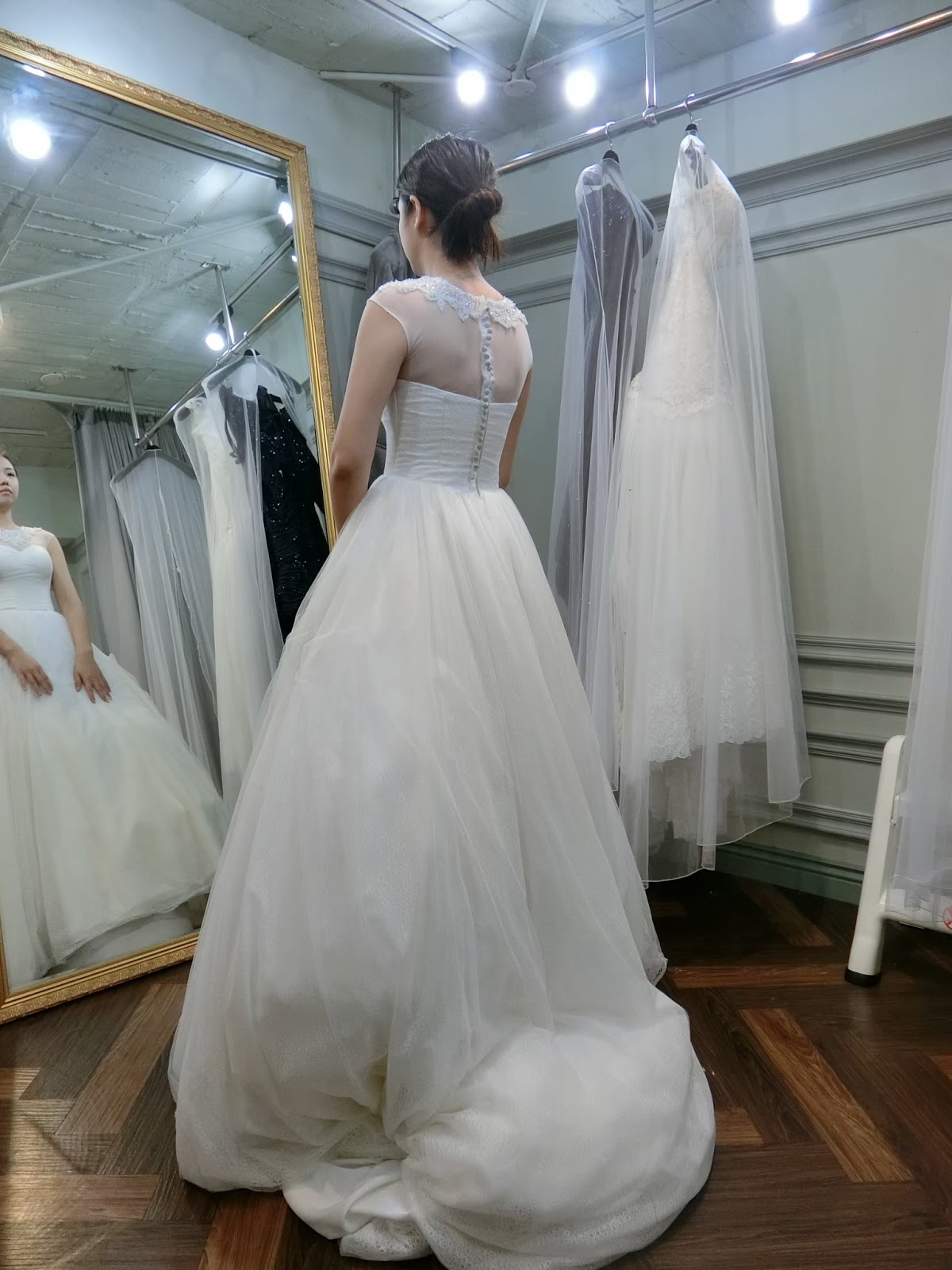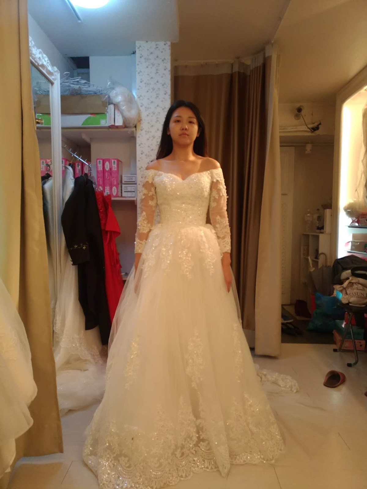 我..歷經至少十間店.....試穿了至少50件,才下定決心在某間全租從很便宜的買斷二手婚紗店、攝影師附屬婚紗館、純婚紗租借、婚紗店二手拍賣現場......說是