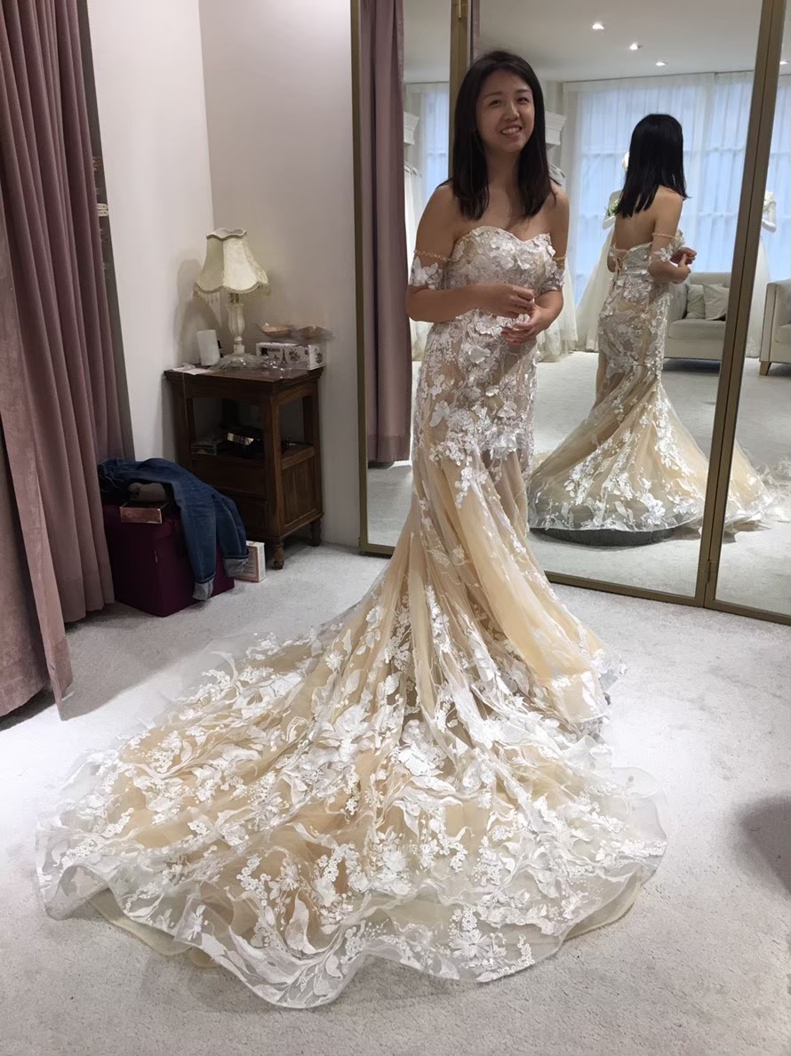 第二次選定一白二晚禮服白紗真的太難挑選了,理性的考量綜合因素: 夏天婚禮、戶外婚禮、隆重感、長尾巴、歐美