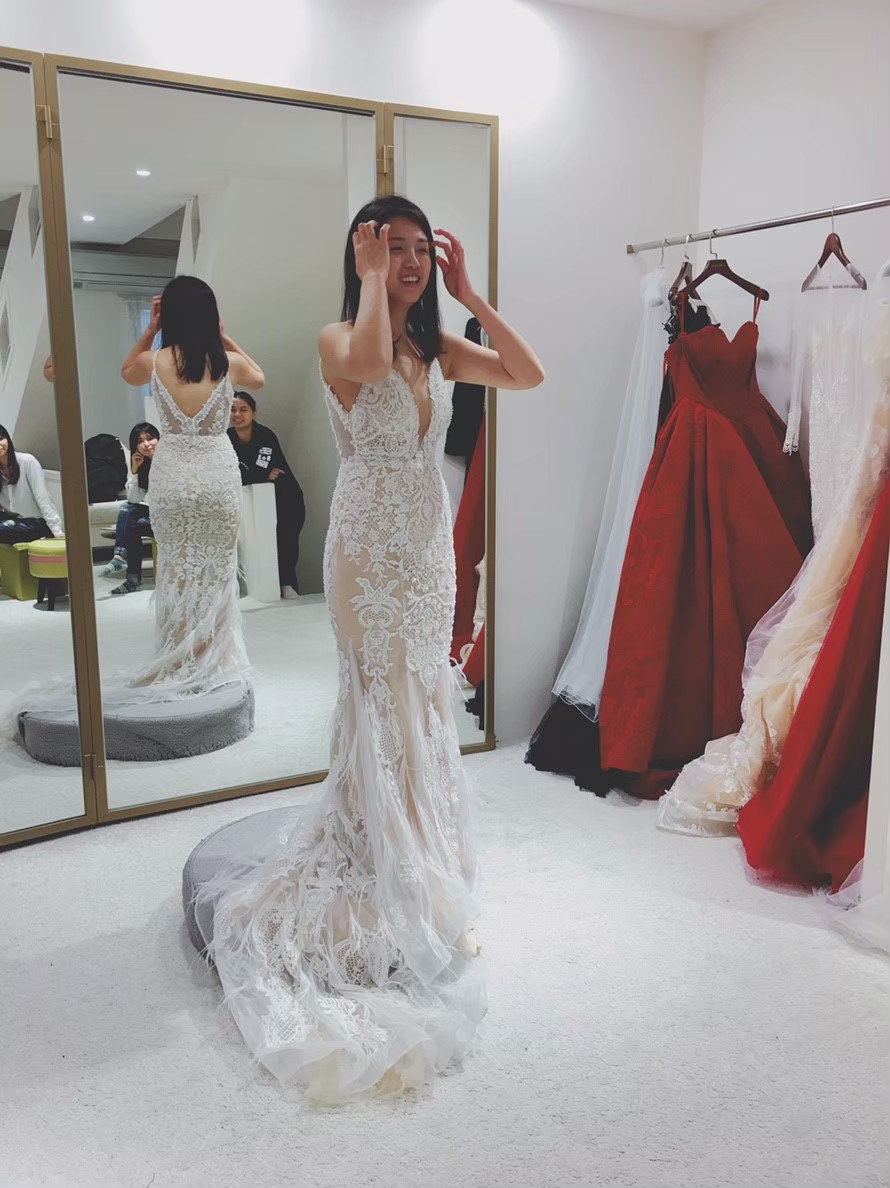 第一次約看,當天下訂金,順便談優惠。一次會有兩個小秘書幫忙找禮服跟試穿,一次只接