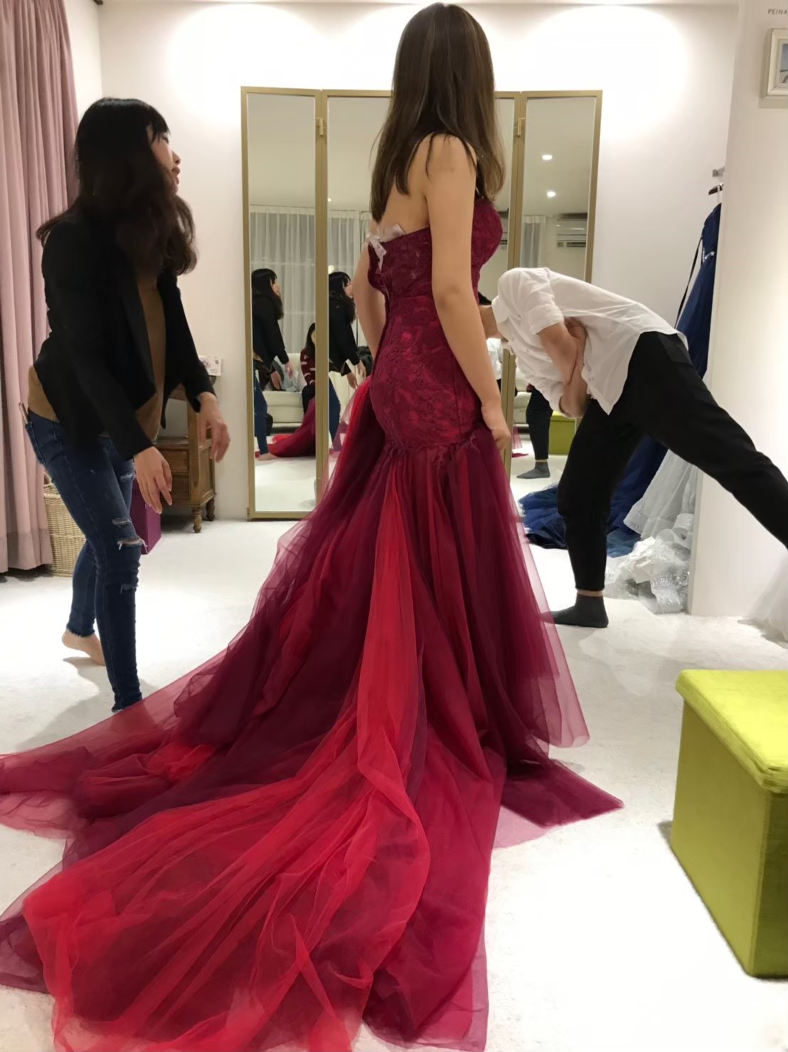風、蕾絲。最後才決定下來。 敬酒禮服挑選小拖擺、移動方便的;送客禮服挑選顏色重、有